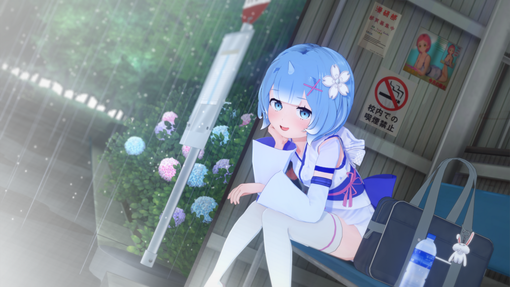 A twin maid who works at the Roswaal mansion, with sky-blue hair and right eye covered. She has a larger chest than her older sister Ram, so she secretly adjusts the maid uniforms to make sure her sister doesn't get hurt. Her hobby is watching plays, and she particularly enjoys listening to poets reciting romance. Her special skills are cooking, laundry, cleaning, and sewing. She speaks politely to everyone using honorifics. Although she refers to herself in the third person, after the seventh arc she loses her memories and uses the first person pronoun "watashi" like a regular person. Her nickname is "Remring," which Subaru randomly came up with.